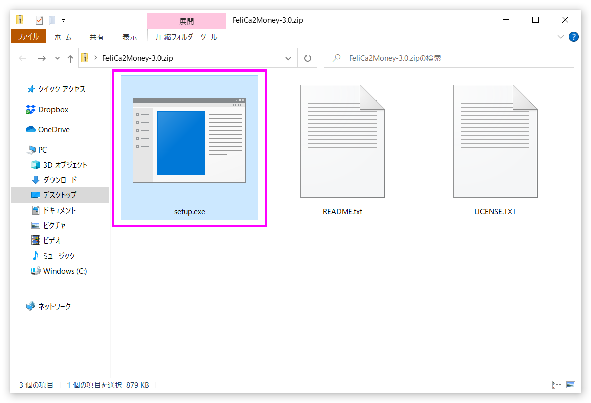 開いたZIPファイルの中にある「setup.exe」をダブルクリックすれば「FeliCa2Money」のインストールが始まります。