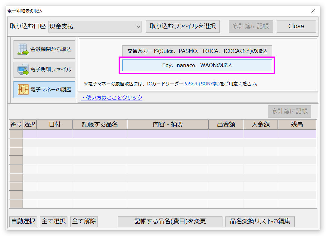 [Edy、nanaco、WAONの取込]ボタンをクリックします。