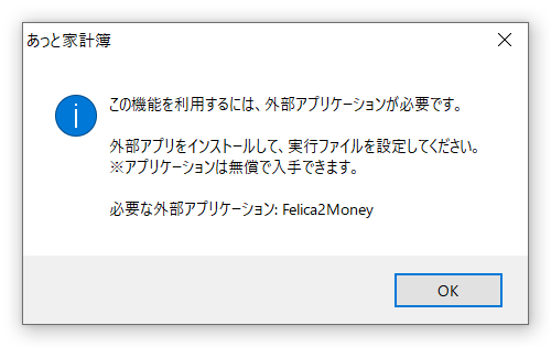 A以下のような「この機能を利用するには、外部アプリケーションが必要です」というメッセージボックスが表示されるので[OK]ボタンを押します。
