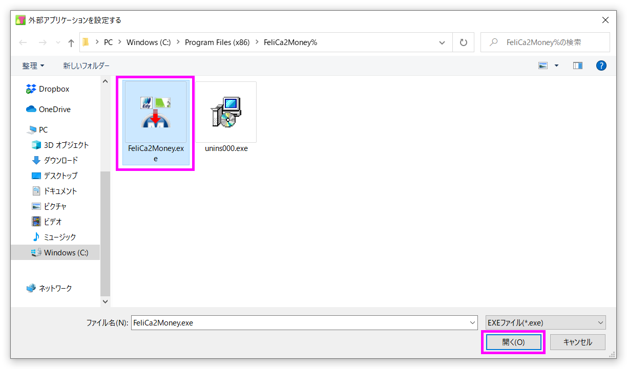 「FeliCa2Money」の実行ファイルである「FeliCa2Money.exe」を選択して[開く]ボタンを押します。